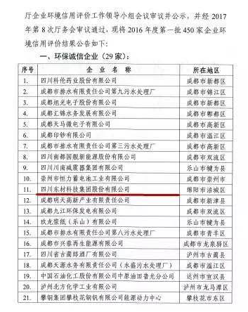 7月21日,四川省環境保護廳發布2017年第1號公告,公布了2016年度第一批企業環境信用評價結果。在全省申報的851家企業中,包括四川東材科技集團股份有限公司在內的29家企業獲得四川省2016年度“環境誠信企業”稱號。